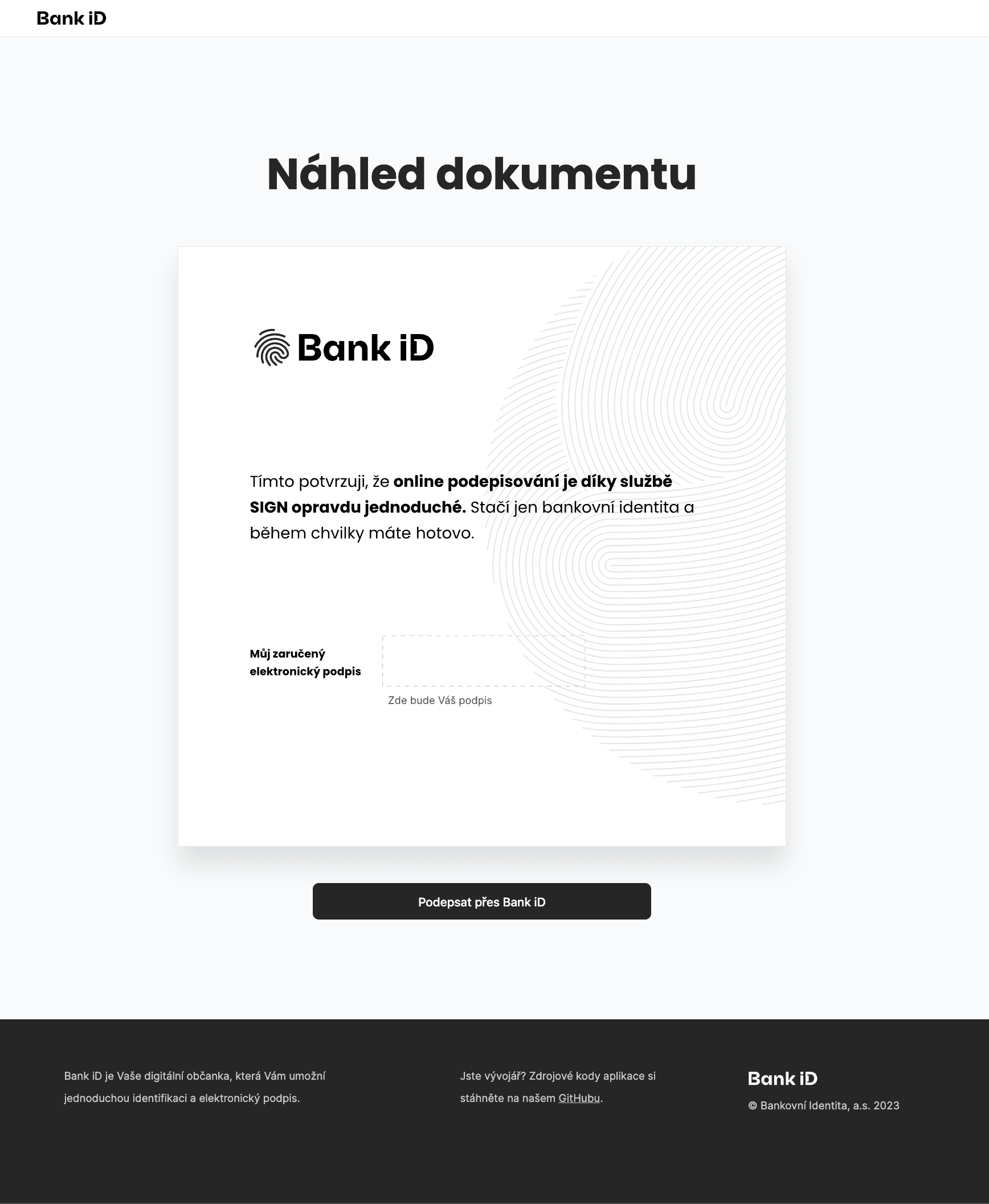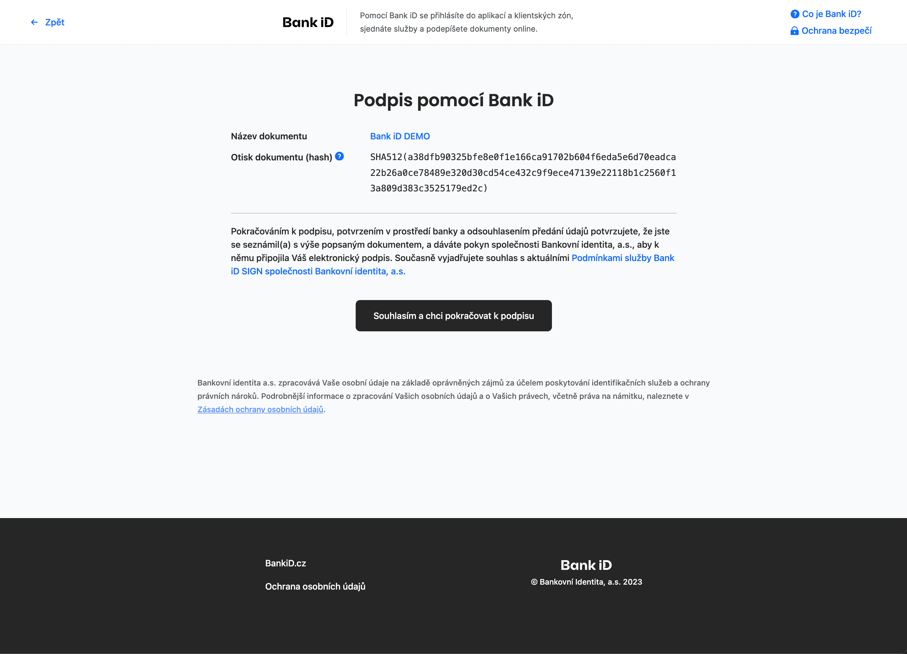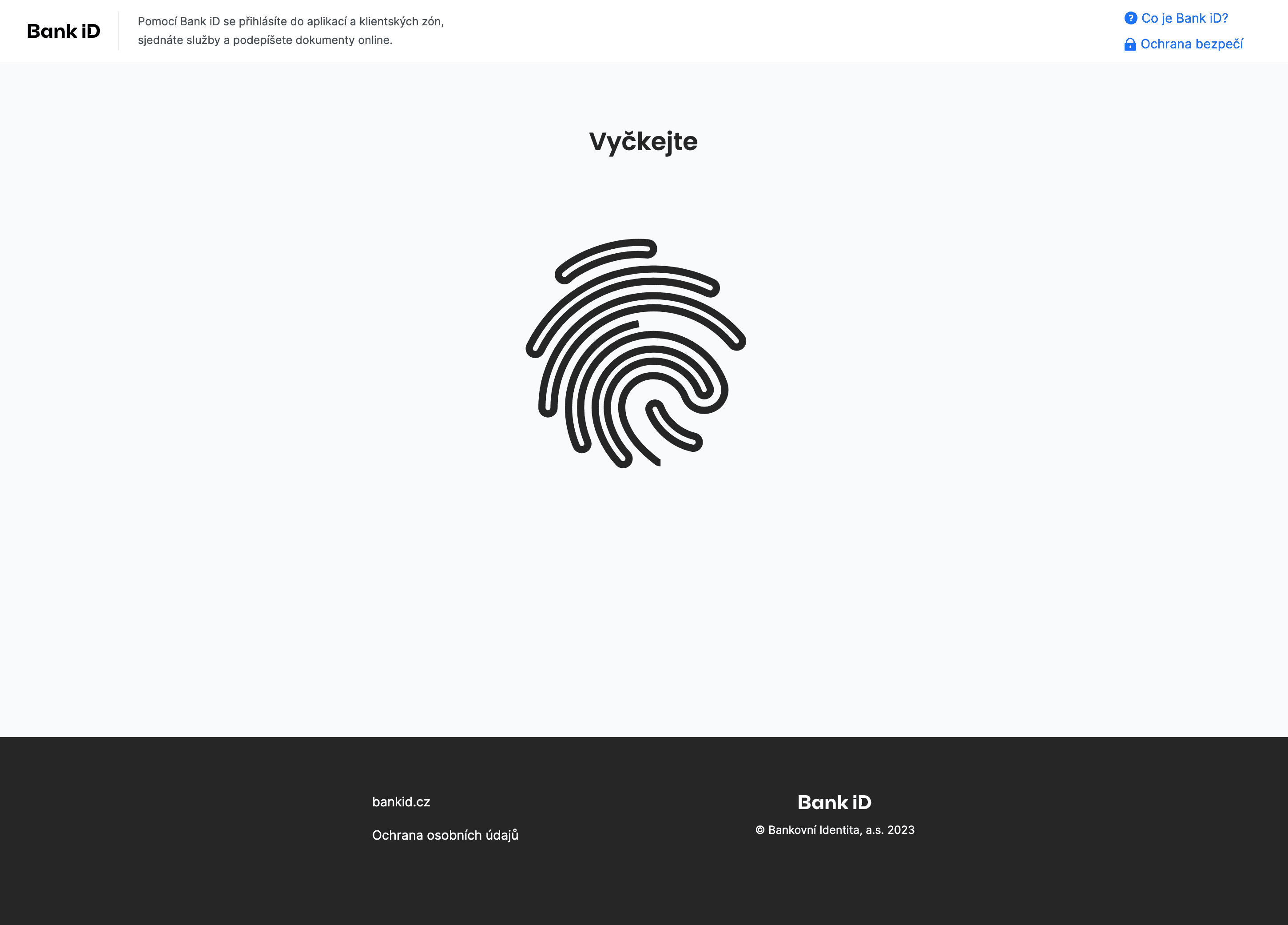 Následující obrazovky jsou ukázky vlastních obrazovek Bank iD, které v rámci procesu Bank iD ověření či podpisu dokumentu vidí uživatel.
