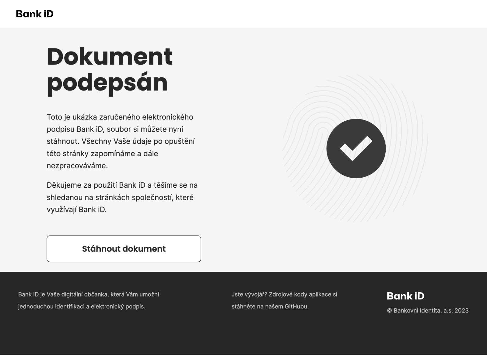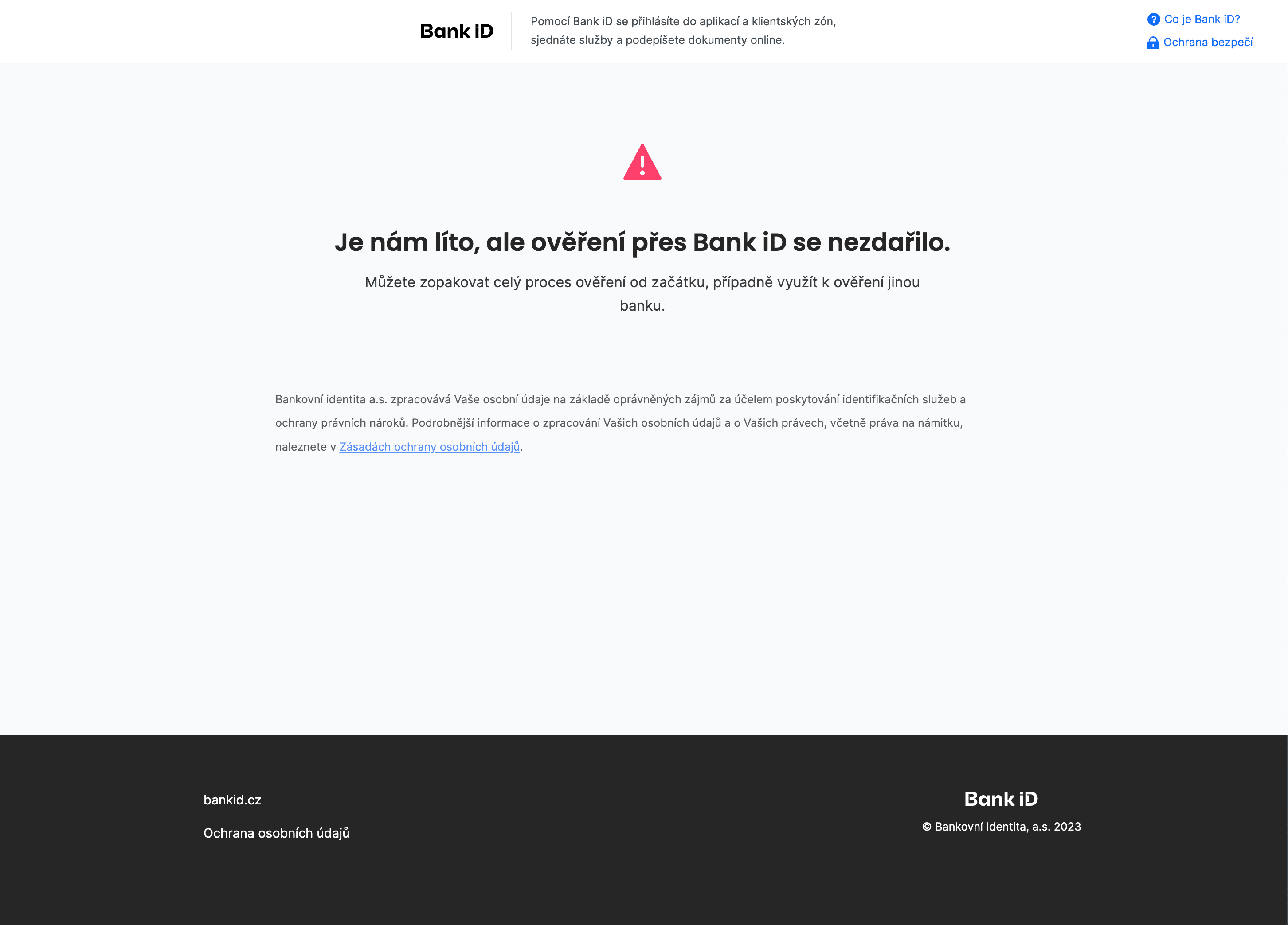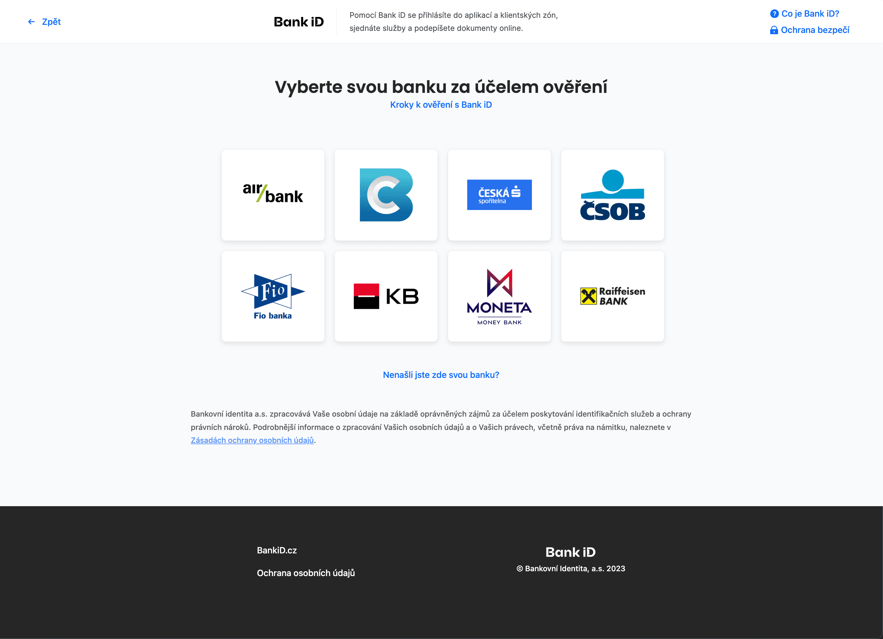 Následující obrazovky jsou ukázky vlastních obrazovek Bank iD, které v rámci procesu Bank iD ověření či podpisu dokumentu vidí uživatel.